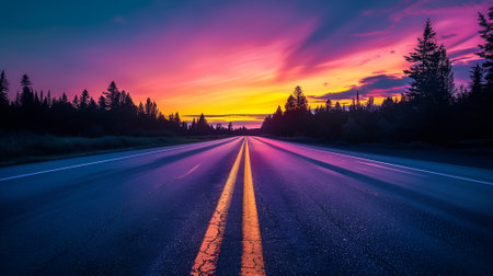 A breathtaking sunset casts vibrant colors across the sky, illuminating the open road ahead. The horizon fades into a colorful swirl of orange and blue hues.