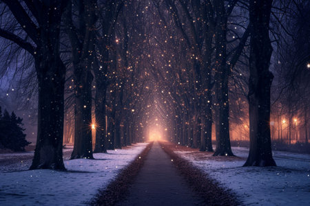 A Path Cutting Through a Snowy Forest, Romantic tree alley underneath a starlit sky in a park, AI Generated