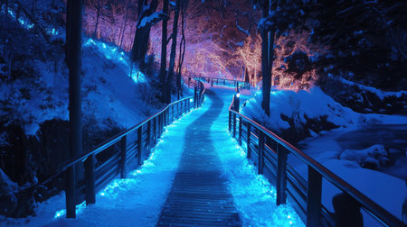A mesmerizing winter pathway illuminated with vibrant blue lights surrounded by a serene snow-covered forest, creating a magical nighttime atmosphere.