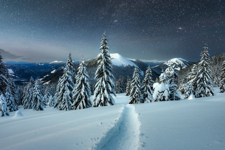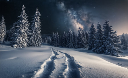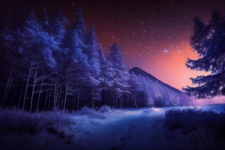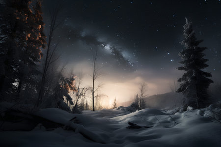 This captivating winter night landscape depicts a serene, snowy scene with glistening stars, a frosty horizon, and moonlight illuminating the tranquil surroundings. A perfect portrayal of