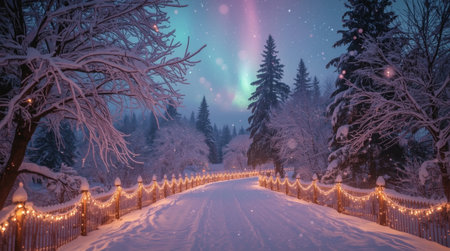 Winter landscape. A snow-covered road with houses, festive lighting from garlands, and the northern lights. Happy New Year 2026 and Merry Christmas.