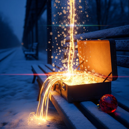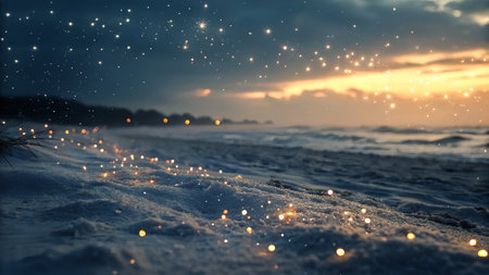 An artistic depiction presents a winter landscape with illuminated snowflakes floating within a smoky atmosphere. Soft blue and white hues blend, complemented by warm golden bokeh lights. This serene image could be suitable for various commercial purposes, including seasonal campaigns or background visuals.