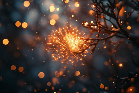 Golden sparks illuminate the dark surroundings as they twinkle on the branches of trees. The serene atmosphere captures the beauty of winter with a magical glow in the night sky.