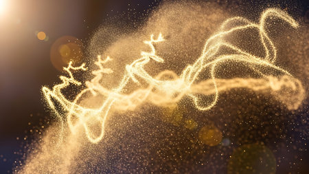 A close-up image of hands gently holding glowing golden glitter particles. The scene is illuminated by soft, magical lighting, with bokeh effects in the background. The image evokes a sense of wonder, mystery, and magic, perfect for fantasy themes.
