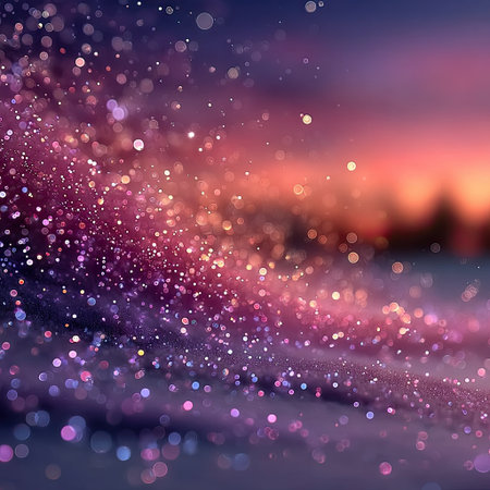 An abstract artwork features a glittering wave of particles, dominated by shades of purple and pink. A bokeh effect adds depth and highlights the flowing composition. The background suggests a sunset with warm tones. This image could be used for various design projects, web backgrounds, or artistic presentations.