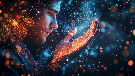Portrait of a man looking at his hand as glowing light particles surround him, creating a magical and futuristic atmosphere.