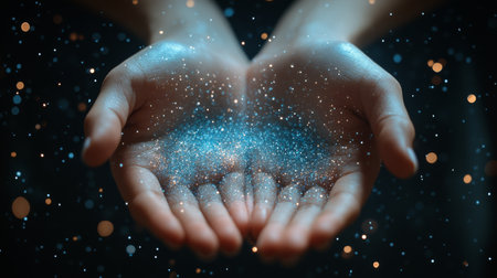 Two open hands capture and release sparkling particles, creating a magical atmosphere. Background appears blurred, enhancing focus on the glowing elements and joyful expression.