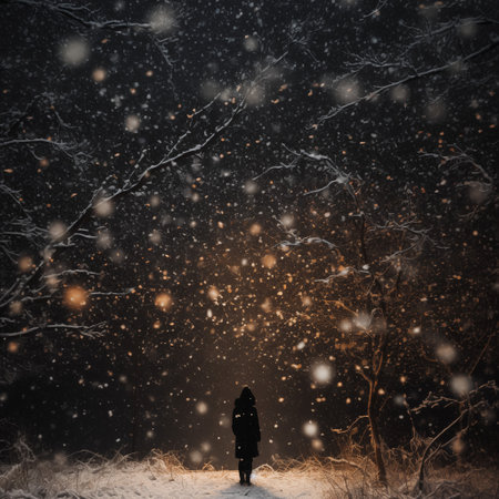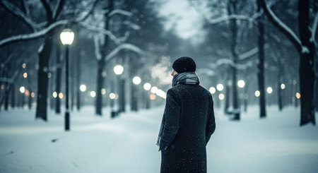 walking snow night street light traversing shadowy city ambient amber powdered sugar serendipity stunning ski, generative ai