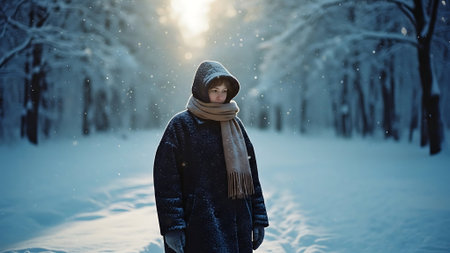 A young woman standing in a snowy landscape, wearing a warm hat and scarf, looking contemplative, surrounded by snow-covered trees