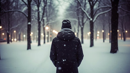 A person walking through a snowy forest path during a gentle snowfall in wintertime, wearing a cozy hat and scarf