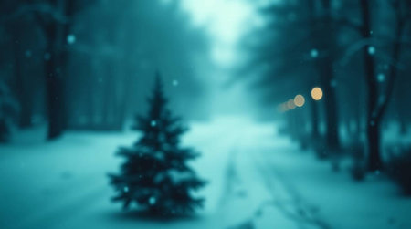 Soft blurred city lights glowing in the distance over a snowy winter landscape at night. Atmospheric bokeh background with cold blue tones, shallow depth of field and copy space. Ideal for winter holidays, Christmas, New Year, seasonal backgrounds, calm mood, silence, cold weather, and abstract nature concepts.