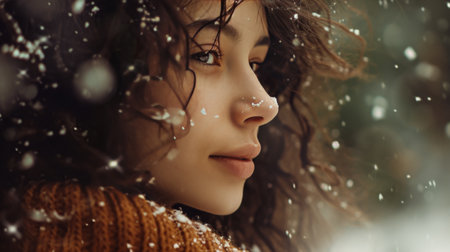 A woman with long dark hair wearing a cozy sweater, standing in a snowy forest with soft sunlight filtering through the trees