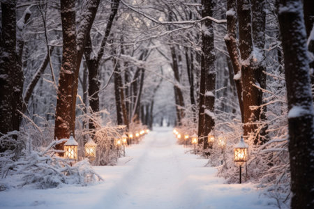 A view down a snow-covered path winding through a dense forest of pine trees. The trees are heavily laden with snow, creating a serene and pristine winter landscape. The path is illuminated by a multitude of small, sparkling fairy lights that hang from the branches and float in the air, casting a warm, magical glow. A bright, ethereal light source emanates from the end of the path, the viewer deeper into the enchanted scene. The atmosphere is one of wonder, peace, and a touch of mystery.