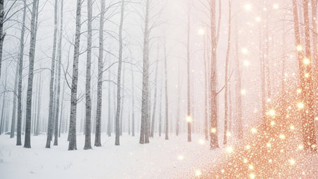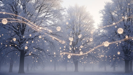 A serene winter forest scene bathed in soft, warm light. Tall trees are heavily laden with frost and snow, their branches adorned with numerous glowing golden orbs and delicate, swirling light trails. The background is softly diffused, creating a dreamlike and atmosphere. The overall mood is peaceful, magical, and whimsical, evoking a sense of wonder and tranquility.