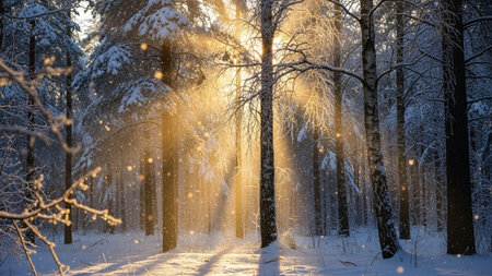 A winter forest scene where warm golden sunbeams pierce through the dense canopy of snow-covered trees. The light creates a magical, ethereal glow, illuminating falling snowflakes and casting long shadows on the pristine white snow. The branches of the trees are heavily laden with snow, and a sense of profound peace and stillness pervades the atmosphere. evokes the quiet beauty and serenity of a winter wonderland.