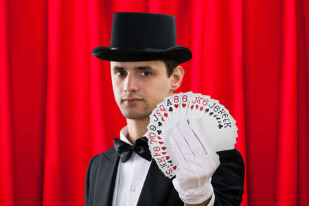 Magician shows trick with playing cards. Sleight of hand. Manipulation with props.