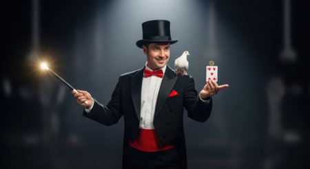 A smiling illusionist in formal attire conjures a dove and a playing card using a glowing wand.