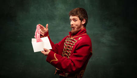 Handsome young man in image of medieval hussar posing isolated on dark blue background. Retro style, comparison of eras concept.