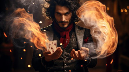A master magician weaves a spellbinding tale with cards and shimmering sparkles Expert sleight of hand transforms the ordinary into the extraordinary, defying logic and captivating the audience with illusions that leave them in awe and wonder AI Generative