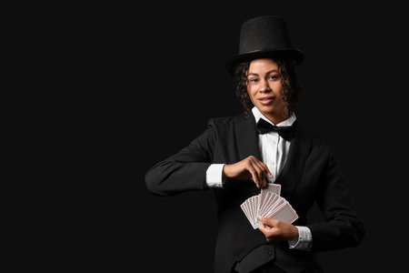 Mystical Masquerade: Captivating Illusionist Unveils Enigmatic Act with Sleek Deck of Midnight Playi