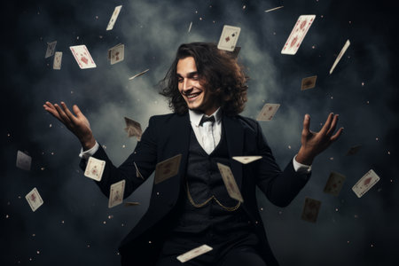 A skilled magician captivates the audience as he showcases his talent with flying playing cards, dressed in classic attire. The atmosphere is filled with suspense and intrigue.