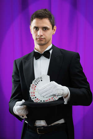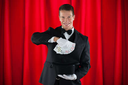A performer in formal attire conjures playing cards from a hat with a flourish.