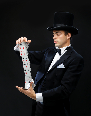magic, performance, circus, gambling, casino, poker, show concept - magician in top hat showing trick with playing cards
