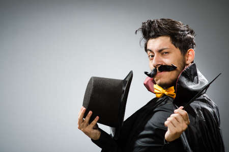 The picture of the smart magician doing the trick with the magic wand in the hand, the wizard is doing entertaining in the circus, the performer is performing the magic show for entertainment. AIG43.
