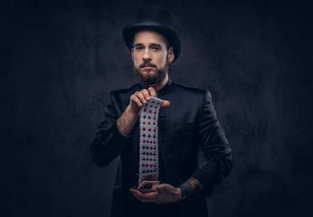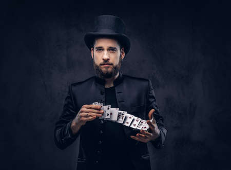 Professional Occupation. Magician in suit hat and gloves standing isolated on wall showing trick with cards posing smiling mysterious