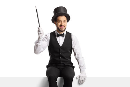 Magician sitting on a panel and holding a magic wand isolated on white background