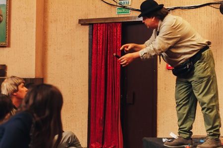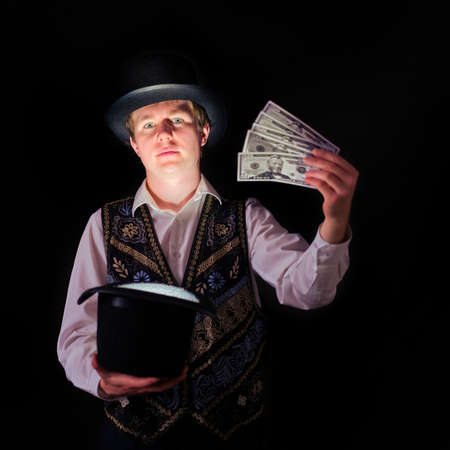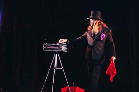 A magician shows tricks around a magic hat. Concept of fun and unexpected