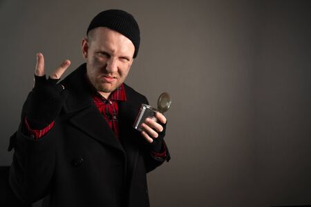Sad homeless man shows the figure with his fingers. life concept to find a way out in difficult situations.