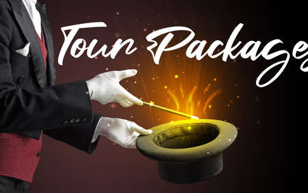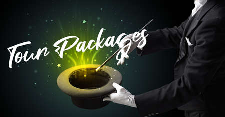Magician is showing magic trick with Tour Packages inscription, traveling concept