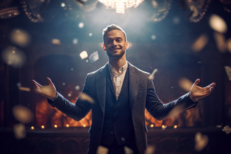 Magician performs spellbinding tricks on stage, captivating audience with mystique and wonder