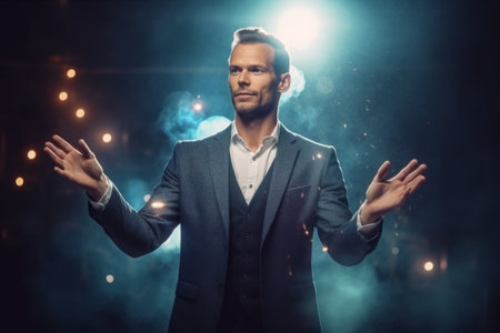 A classic stage magician, clad in a black suit, performs a captivating illusion with a top hat The showmanship is undeniable as he pulls off a surprise reveal, leaving the audience in awe This is a performance that combines conjuring, tricks, and illusions for an unforgettable magic show AI Generative
