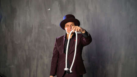 Consummate mastery of magician. The magician shows a trick with a rope.
