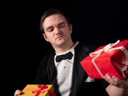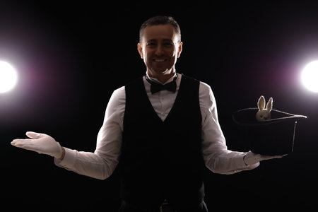 Magician with rabbit, Juggler man, Funny person, Black magic, Illusion on a black background