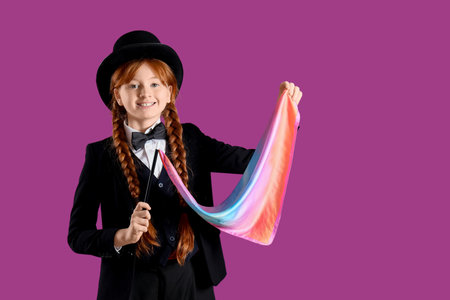 positive magician in suit and hat holding wand isolated on grey with glowing illustration