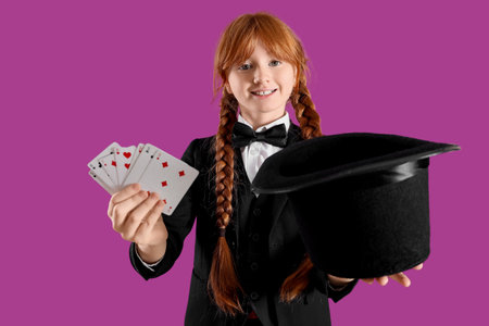 Beginning novice magician conjurer. Girl with cards in her hands in a hat with a top hat and a striped shirt with a bow tie