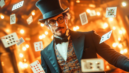 Illusionist wearing a top hat performing a card trick surrounded by sparks and playing cards