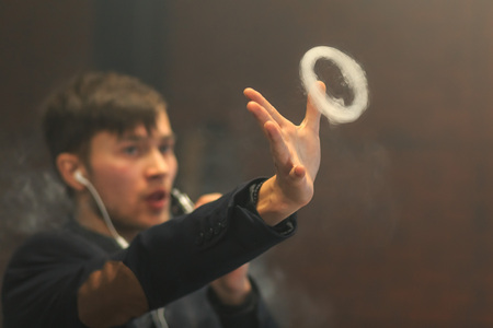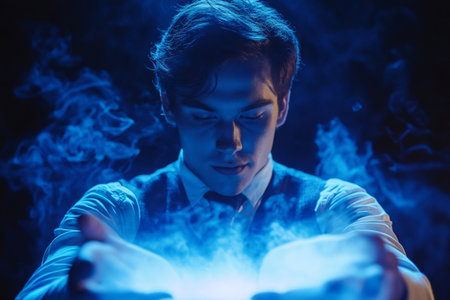 Young illusionist holding a glowing object surrounded by blue smoke, creating a mysterious and magical atmosphere