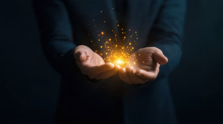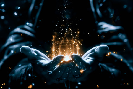 Two hands extend forward filled with bright glowing particles, symbolizing creativity, hope, and inspiration, set against a captivating dark background.