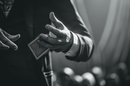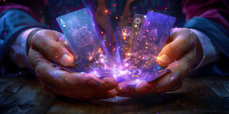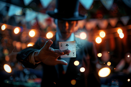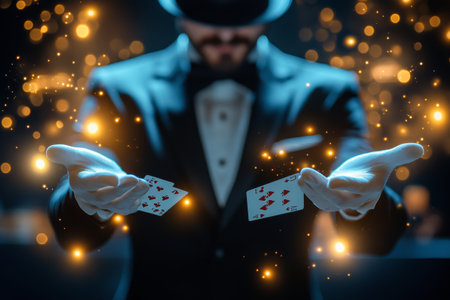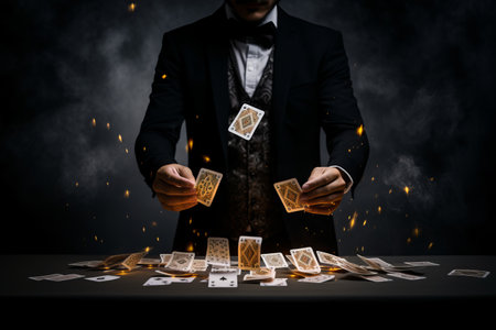 A magician demonstrates an enchanting card trick with sparkling magic in a dimly lit room during a captivating performance