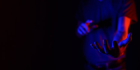 Exposed hands making gestures in studio with blue light with copy space. Virtual reality and digital interface technology.