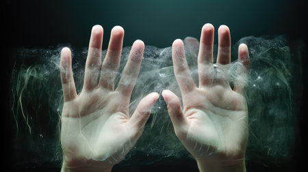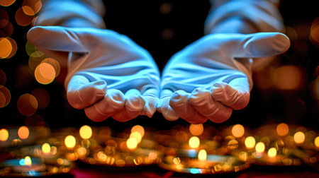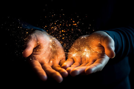 A Shimmering gold dust sparkles in open hands, creating magical effect