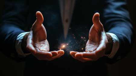 Conceptual -A business man in a suit holding glowing sparkles between his hands. 4:3 portrait crop with shallow depth of field and slightly faded colors.