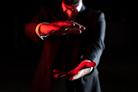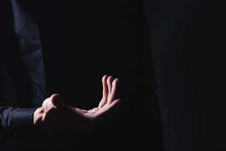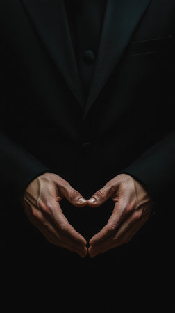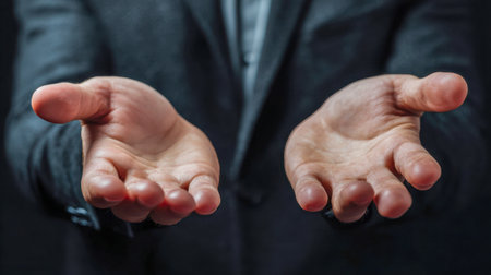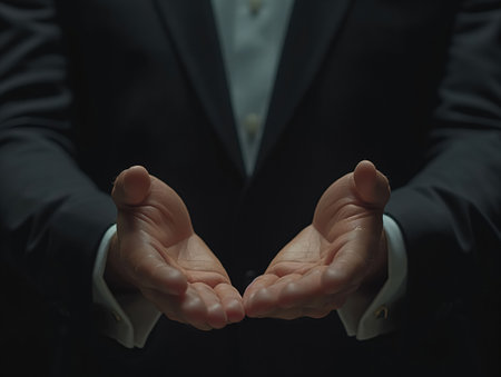 A professional dressed in a sleek dark suit extends his arms outward, embodying a moment of assistance or openness amid a stark black backdrop.