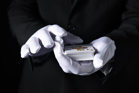 Magician illusionist with a deck of cards showing card tricks focus in front of wealthy rich guests on party event wedding celebration, juggler show, prestidigitator performance on stage