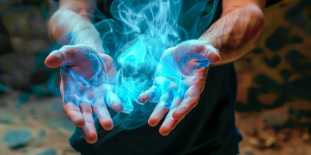 Ethereal Blue Energy Between Hands in Mystical Atmosphere.