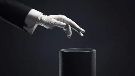 A classic stage magician, clad in a black suit, performs a captivating illusion with a top hat The showmanship is undeniable as he pulls off a surprise reveal, leaving the audience in awe This is a performance that combines conjuring, tricks, and illusions for an unforgettable magic show AI Generative